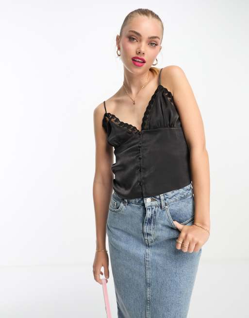 Miss Selfridge - Caraco en satin avec bords en dentelle - Noir