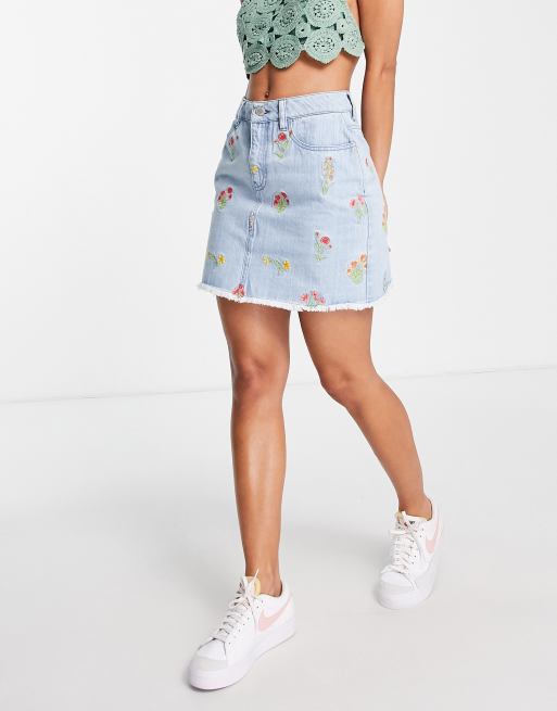 Miss Selfridge - Jupe en jean avec broderies fleuries - Délavage moyen