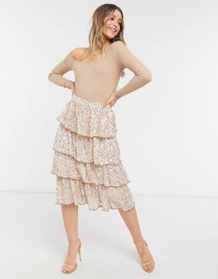 Miss Selfridge - Jupe mi-longue volantée à sequins - Blush