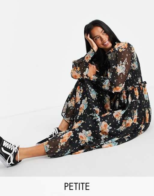 Miss Selfridge Petite - Robe mi-longue à encolure haute et corsage froncé avec imprimé à fleurs