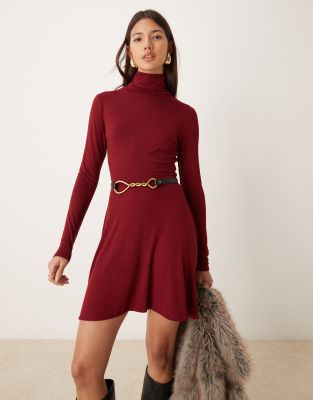 Miss Selfridge - Robe ajustée puis évasée à col montant - Bordeaux