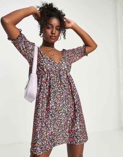 Miss Selfridge - Robe babydoll en jersey avec poignets froncés - Noir à petites fleurs