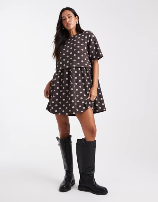 Miss Selfridge - Robe babydoll superposée à pois avec manches courtes - Chocolat