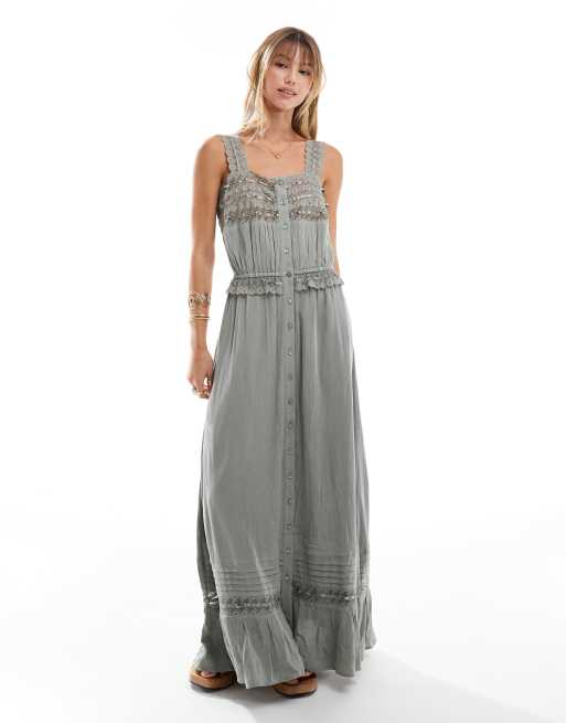 Miss Selfridge - Robe longue à bretelles en tissu froissé et dentelle - Gris délavé