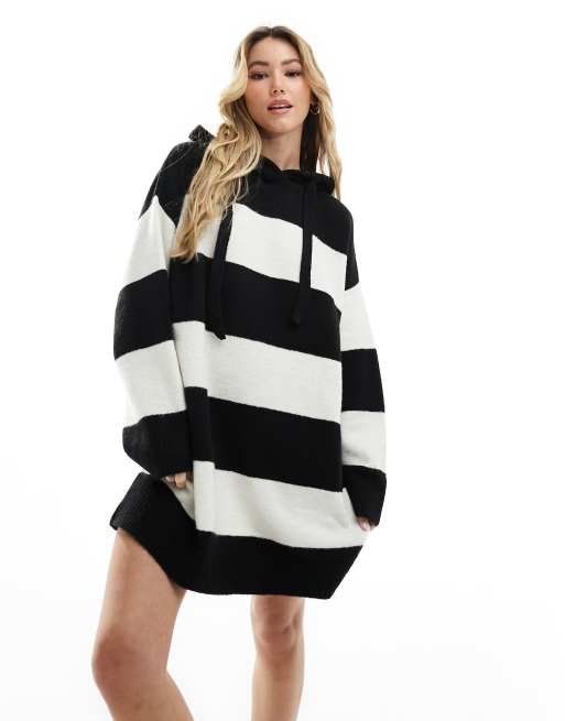 Miss Selfridge - Robe pull en maille à capuche et rayures - Noir et blanc