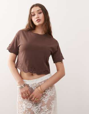 Miss Selfridge - T-shirt avec ourlet à détails ajourés - Chocolat