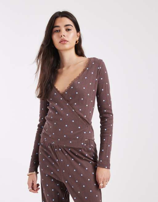 Miss Selfridge - Top cache-cœur en maille pointelle à pois - Chocolat