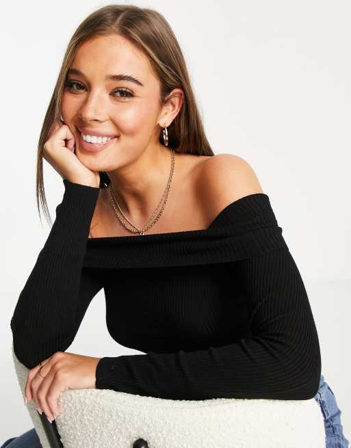 Miss Selfridge - Top côtelé à col Bardot replié - Noir - BLACK