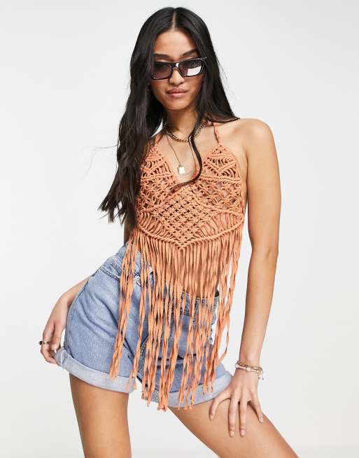 Miss Selfridge - Top dos nu frangé en maille crochetée - Rouille