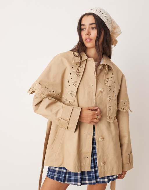 Miss Selfridge - Trench court avec cape ornée de broderies - Taupe