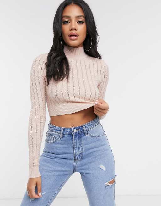 Missguided - Pull court à col montant en maille torsadée - Rose clair