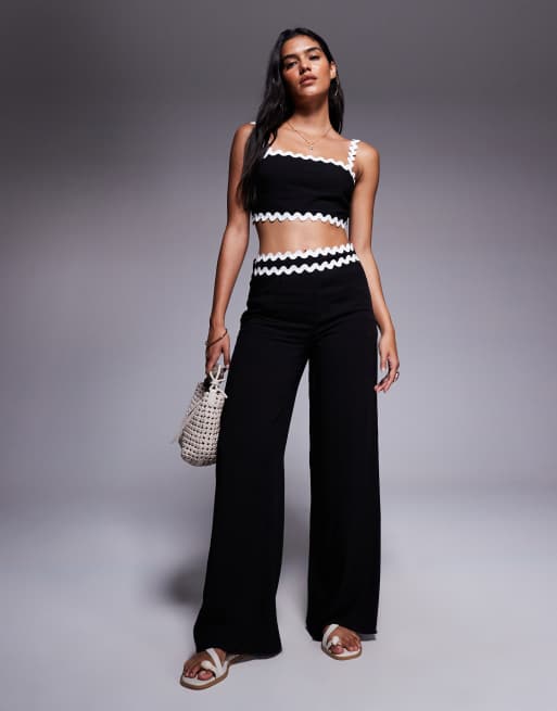 Missy Empire - Ensemble en aspect lin avec pantalon ample et top à encolure carrée et bords festonnés - Noir
