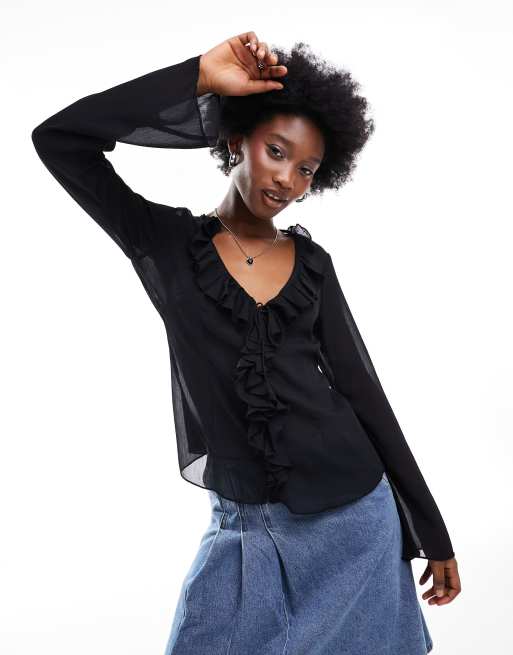 Monki - Blouse volantée sur le devant - Noir
