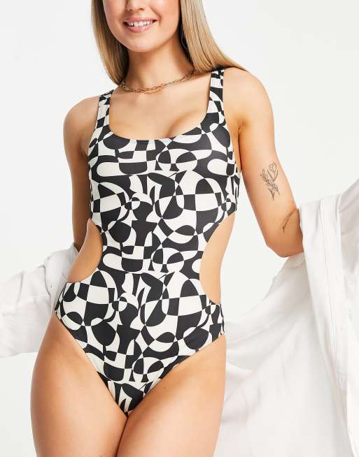 Monki - Maillot 1 pièce à imprimé graphique avec découpes sur le côté - Noir et blanc