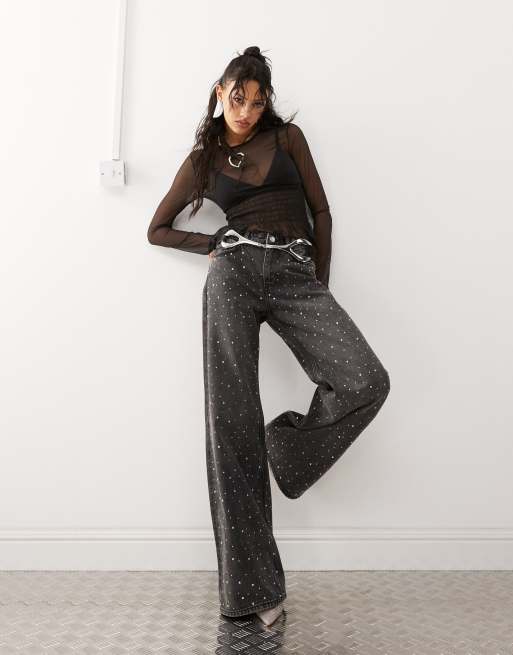Monki - Paz - Jean ample à taille mi-haute avec ornements - Noir