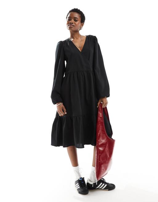 Monki - Robe cache-cœur mi-longue à manches longues - Noir
