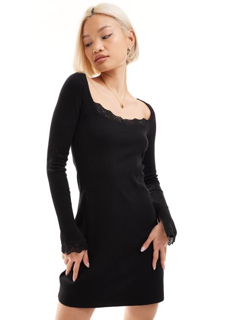 Monki - Robe courte à manches longues avec détails en dentelle - Noir