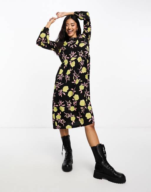 Monki - Robe mi-longue à manches longues et imprimé roses - Noir