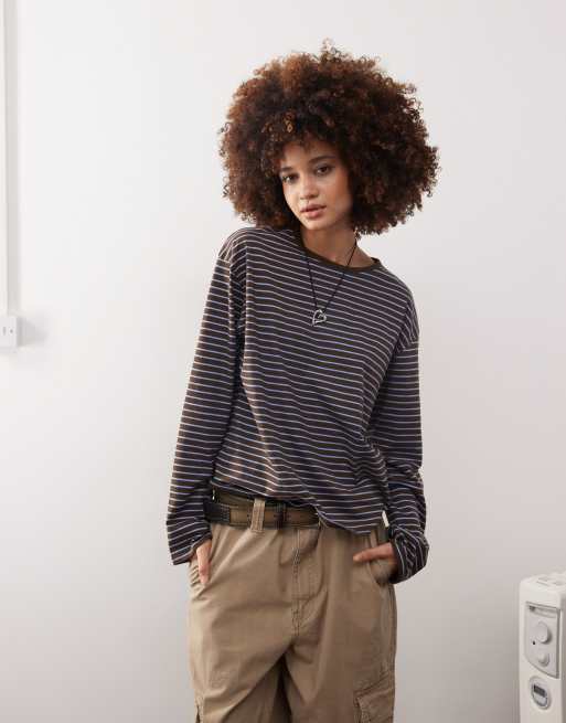 Monki - Top à manches longues et à rayures - Marron et bleu