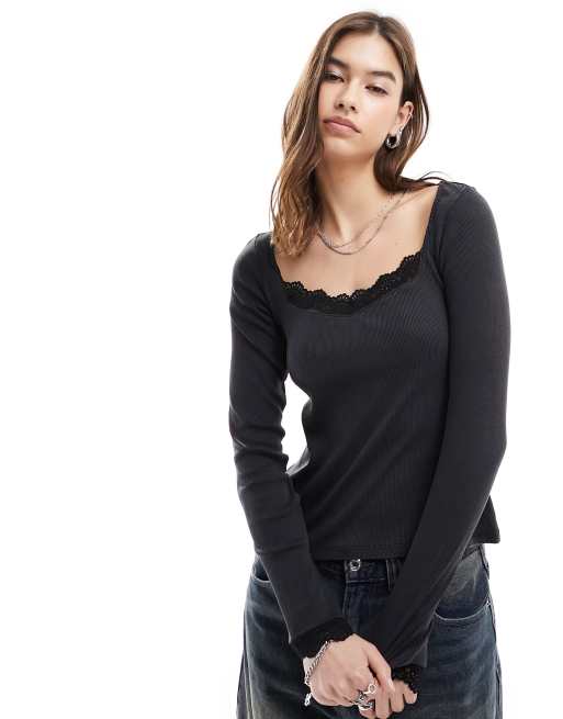 Monki - Top manches longues à décolleté en cœur et bordures en dentelle - Noir délavé