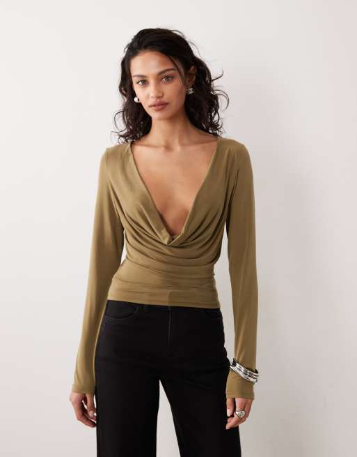 Motel - Adaya - Top manches longues en cupro à col bénitier - Vert olive