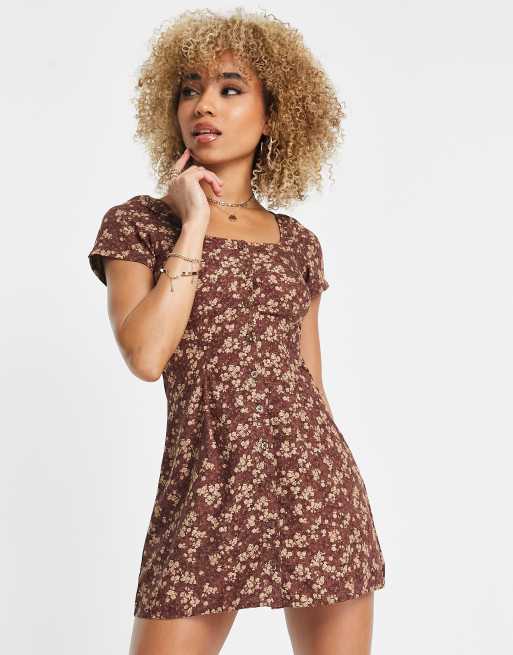 Motel - Robe rétro courte à encolure carrée boutonnée devant - Marron fleuri