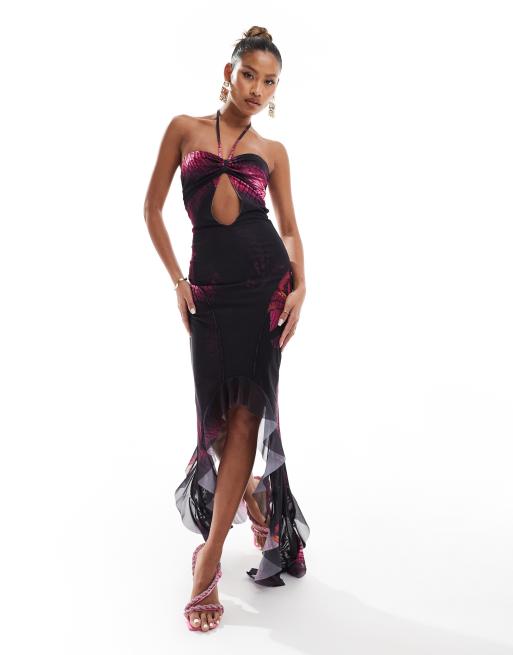 Murci - Exclusivité - Robe longue à fente goutte d'eau et dos nu avec ourlet volanté asymétrique et imprimé lys - Violet