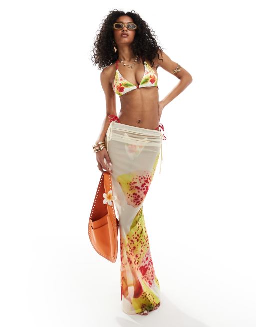 Murci - Jupe longue d'ensemble de plage en tulle - Blanc à imprimé fleurs