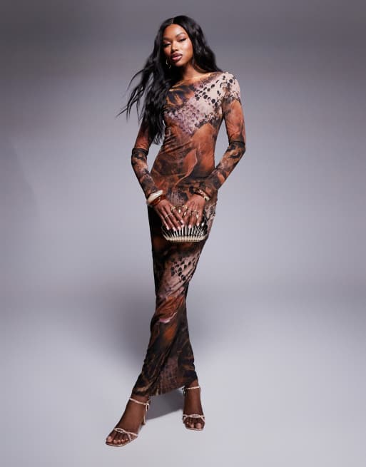 Murci - Robe longue en tulle imprimé peau de serpent avec manches longues - Marron
