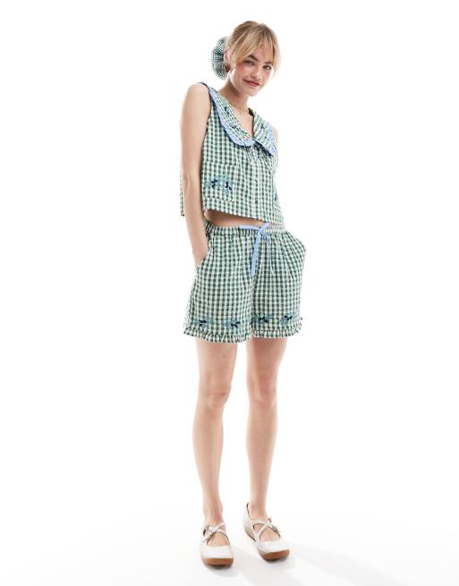 Neon Rose - Short d'ensemble bouffant à bords volantés et carreaux vichy - Vert forêt