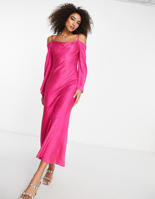 Never Fully Dressed - Robe longueur mollet texturée à épaules nues et manches évasées - Rose