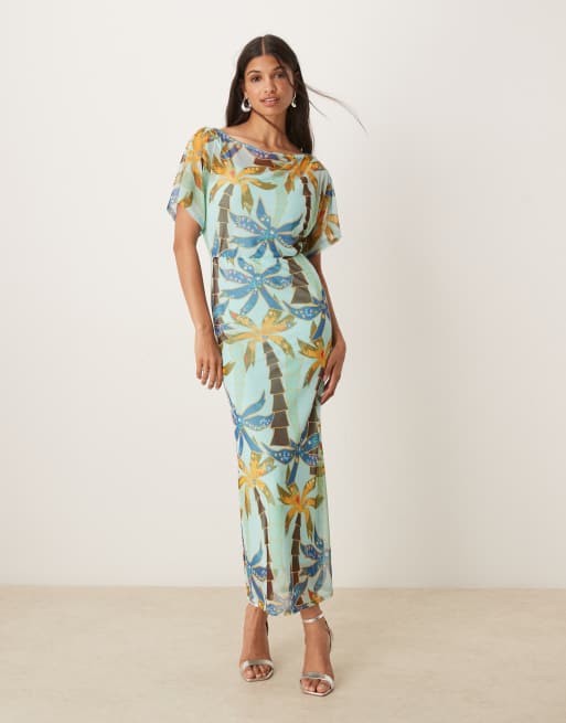 Never Fully Dressed - Tilly - Robe longue et asymétrique en tulle imprimé palmiers - Bleu