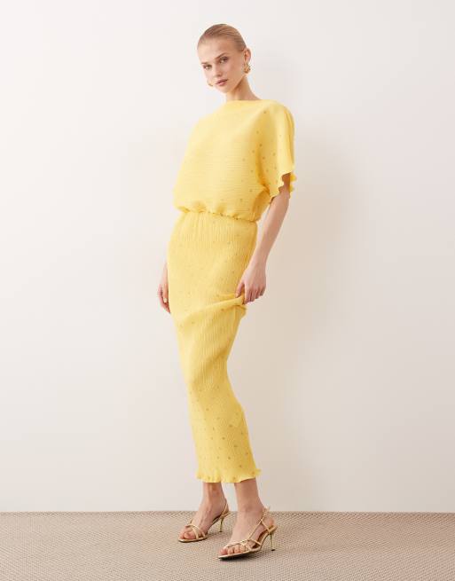 Never Fully Dressed - Tilly - Robe plissée longueur mollet à épaules dénudées avec motif à pois métallisé - Jaune