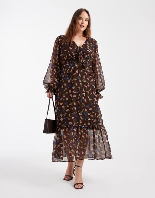 New Look Curve - Robe mi-longue à manches longues et petites fleurs - Marron
