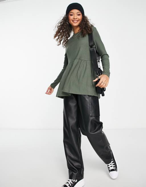 New Look - Top côtelé à manches longues et ourlet à basque - Kaki