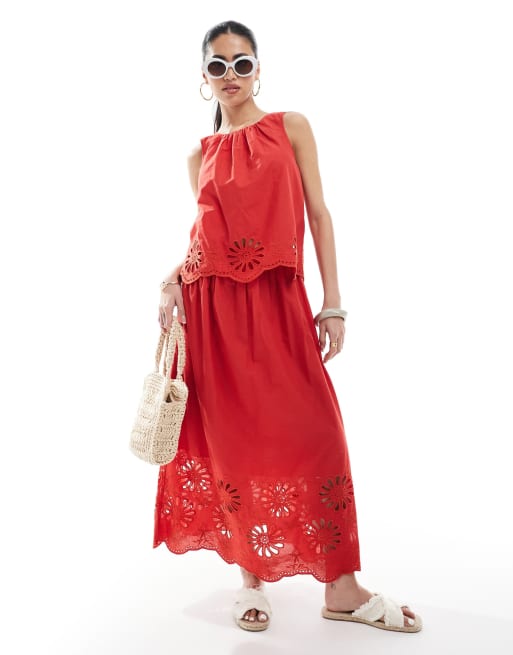 New Look - Jupe d'ensemble mi-longue à ourlet brodé - Rouge