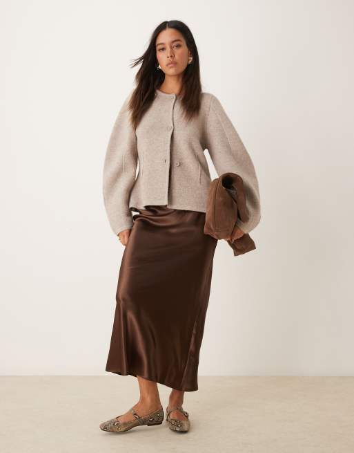 New Look - Jupe mi-longue coupée en biais en satin - Marron