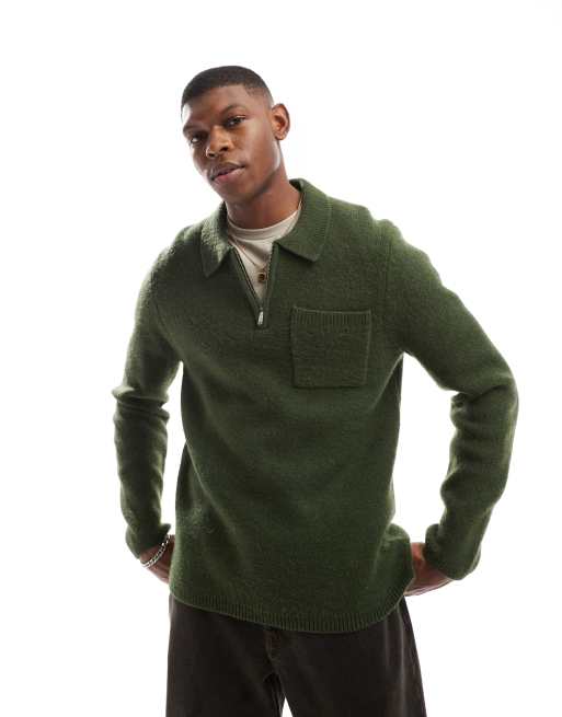New Look - Polo à col zippé en maille brossée - Vert foncé
