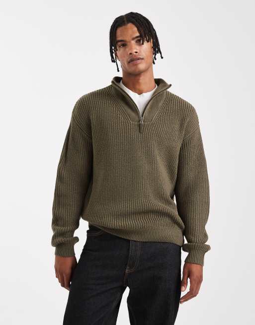 New Look - Pull en maille à col zippé et côtes anglaises - Kaki foncé