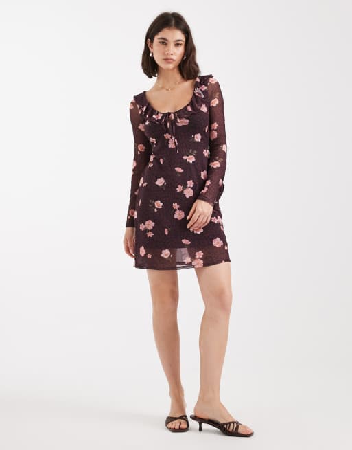 New Look - Robe courte à manches longues en tulle à fleurs - Rouge