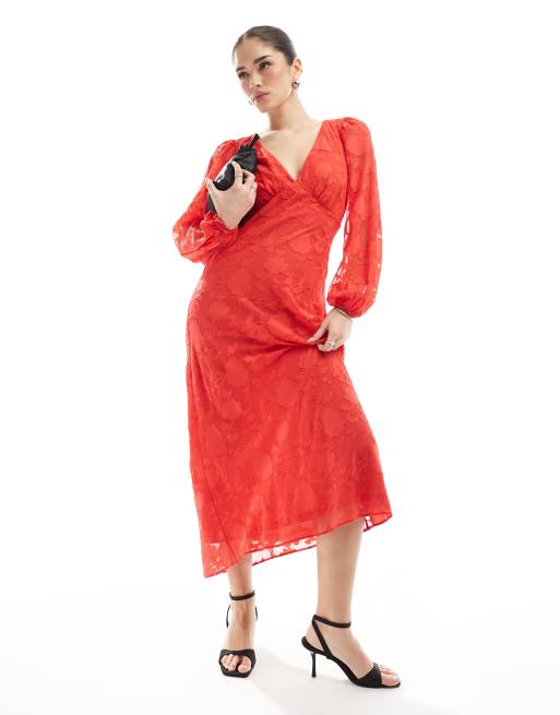 New Look - Robe mi-longue en tissu dévoré à manches longues - Rouge