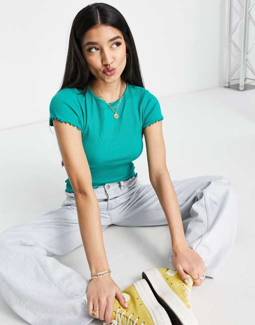 New Look - T-shirt côtelé avec bords à volants - Vert