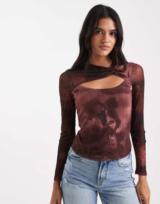 New Look - Top manches longues à découpe en tulle fleuri - Rouge