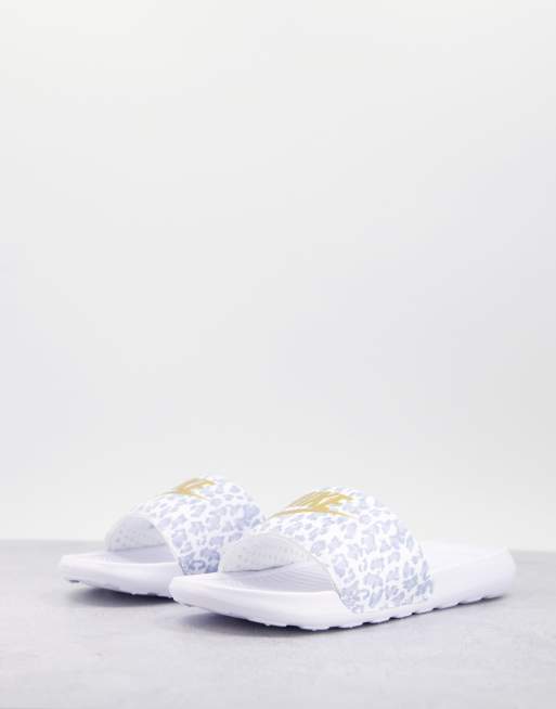 Nike - Victori - Claquettes avec motif léopard et logo virgule doré - Blanc