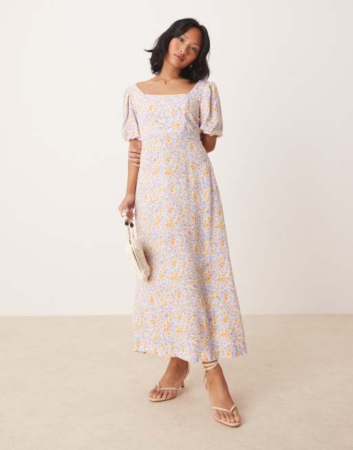 Nobody's Child Petite - Lara - Robe mi-longue à petites fleurs et manches bouffantes - Bleu et orange