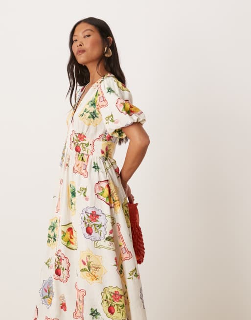 Nobody's Child Petite - Starlight - Robe mi-longue à manches bouffantes et imprimé fruits façon carte postale