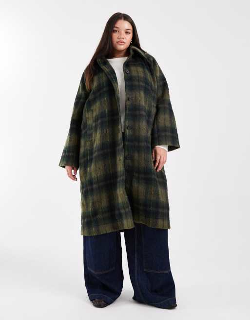 Noisy May Curve - Manteau long aspect laine brossée à carreaux - Vert foncé