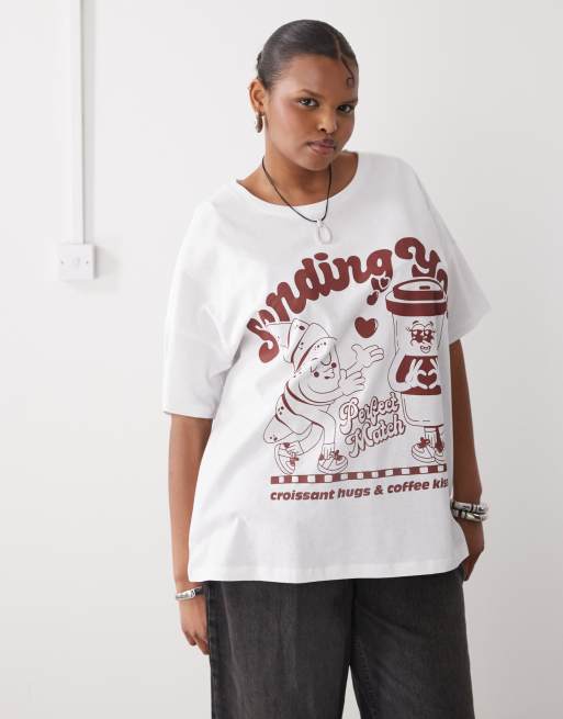 Noisy May Curve - T-shirt oversize à imprimé café - Blanc