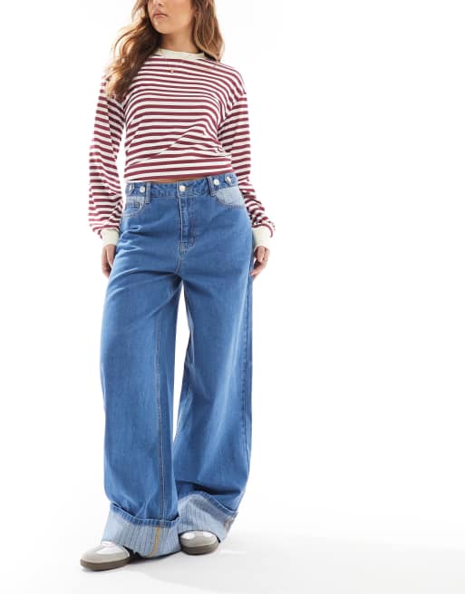 Object - Jean ultra large avec ourlets retroussés contrastants - Bleu moyen