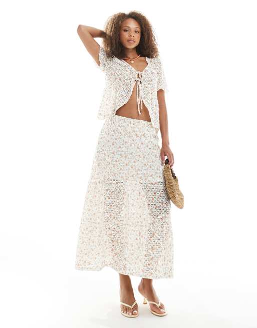 Object - Jupe bohème d'ensemble en maille pointelle à fleurs - Crème